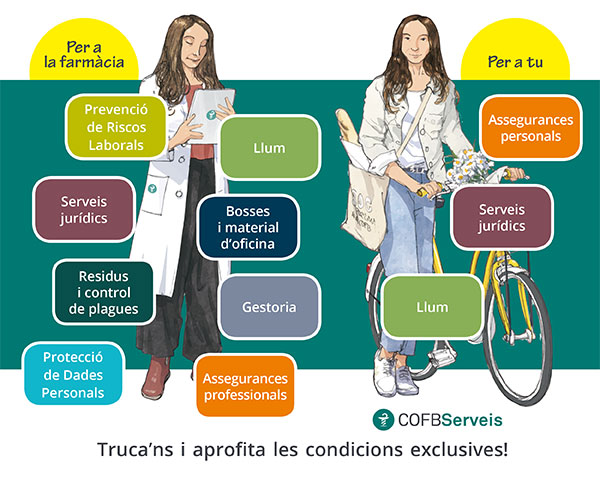 COFBServeis, l’empresa de serveis del COF de Barcelona, fem costat en la gestió de la farmàcia i acompanyem els col·legiats i col·legiades en la sel·lecció i seguiment de les assegurances personals, el subministrament elèctric o els serveis jurídics.