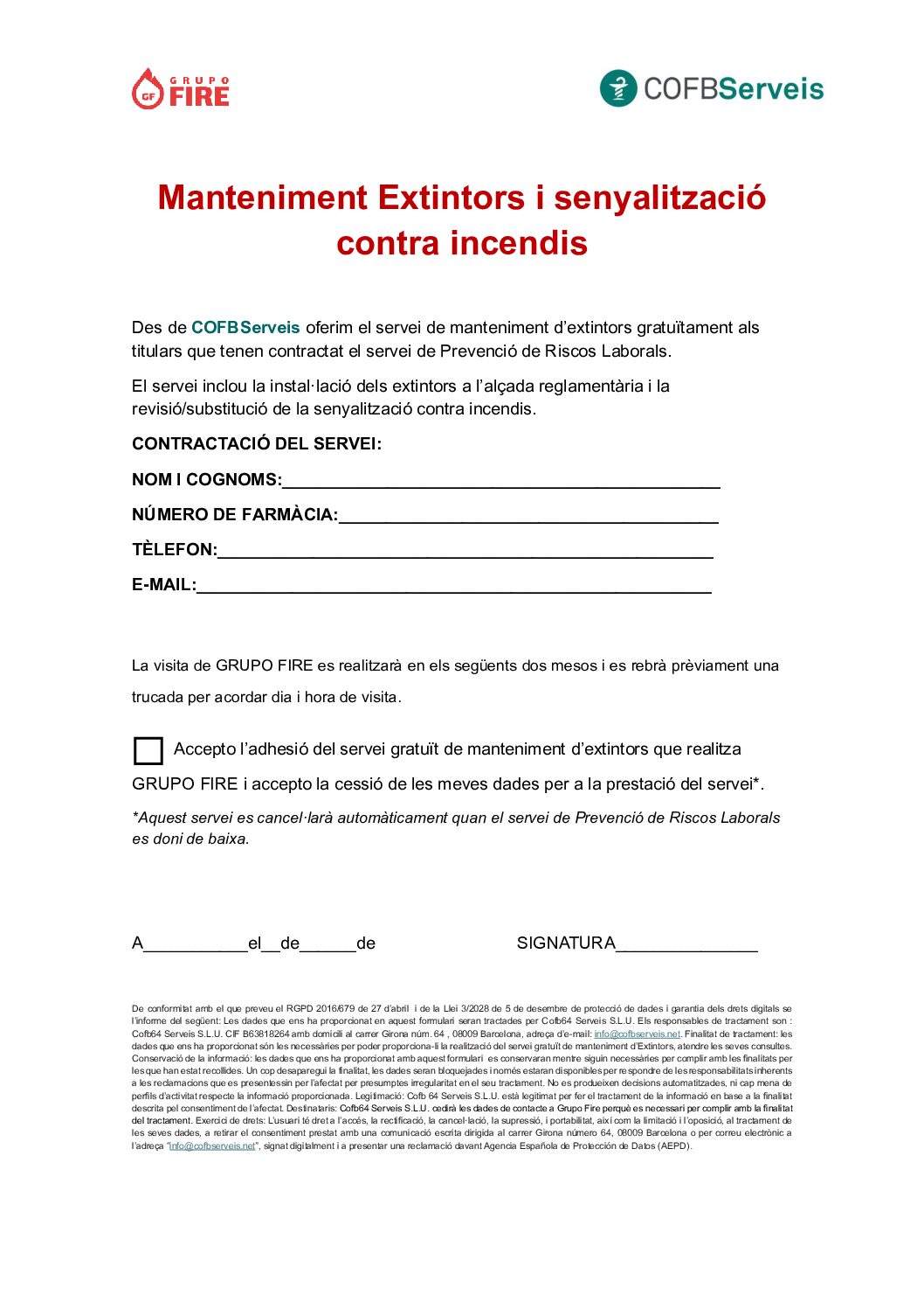 El servei d’extintors s’ofereix gratuïtament als clients de Prevenció de Riscos Laborals de COFBServeis (o els que contractin de nou el servei), dins de la campanya promocional lligada als 10 anys de COFBServeis.